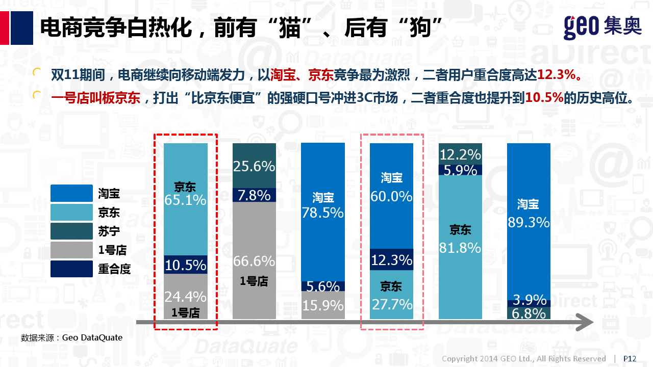 从十月初开始,无论你是打开电视、电脑、平板,还是微博和微信,抑或是乘坐地铁还是走进写字楼,“双十一”的电商促销广告仿佛无处不在,如影随形。市场预热上,相比过去,商家越来越懂得如何更有策略地拨撩起消费者的“蠢蠢欲动”。同时,随着移动互联网的迅速崛起,移动电商已经被越来越多的用户接受,被商家重视。每个移动终端都是触达用户的重要通道。那么问题来了,随着今年“双十一”落下帷幕,随着今年各大商家的策略转型以及与用户沟通方式的转变,谁在PC端拔得头筹?谁在移动端表现最佳?谁成为了今次战役的最终赢家?