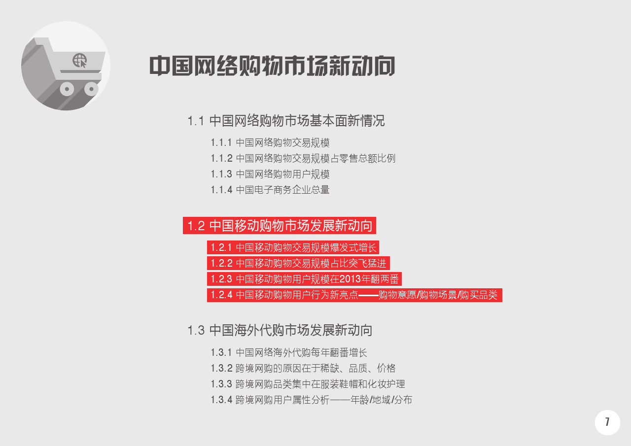 跨境网购的原因在于稀缺、品质、价格,国外品牌应减少中国上市时间差; 价格低廉和品质保障促使服装鞋帽和化妆品护理品成为跨境网购主要品类; 跨境网购用户呈年轻化、高收入的特征,集中在一线发达城市。 爱点击对品牌及广告主的三大建议: 一.完善企业的在线商城,打造从营销到销售的在线闭环 品牌应尝试建立自营的或合作运营的在线商城,不要完全依靠线下店铺 新入华的品牌,在二三线城市往往没有实体店铺,但不应忽视当地购买力 新建的在线商城需要通过各种营销手段扩大用户覆盖,创造流量 二.加快移动端O2O布局,充分利用移动营销和手机互动带动品牌传播 应建立移动网购APP或购物微站,或推出与线下实体店互动的O2O服务 同时在手机端推送投放独具创意的广告和参与型活动,吸引用户关注 售卖实物商品的同时,推出适合网络传播的特色服务,引导用户随手分享 三.国外品牌应加快进入中国步伐,减少商品在中国上市的时间差 在国外上市的商品如在中国引发大量关注,应迅速引入中国扩大影响 海淘网站应发挥信息聚合优势,将用户较难发现并容易错过的品牌优惠扩大传播,吸引用户使用并扩大流量 更多详情,请阅读《2014中国网络购物市场新动向白皮书》(第一部分)全文,点击www.i-click.com/sc/insights/下载完整版。白皮书第二及第三部分《个人护理及彩妆网络购物新动向》和《服饰鞋帽及箱包网络购物新动向》随后发布,敬请期待!