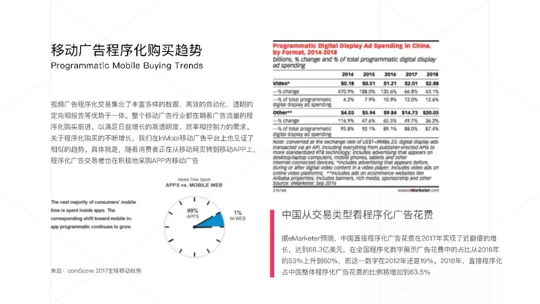 这其中,就广告形式而言,视频广告无疑是最受关注的。据eMarketer数据显示,2016年中国程序化数字视频广告花费达到了12.1亿美元,增长率超过100%。视频在整体程序化视频展示广告花费中所占的比重也从2014年的4.2%上升到了10.9%,增长超过了2倍。同时,eMarketer还预测,在未来至少2年内,程序化视频广告花费的增长将继续保持对电商广告、横幅广告、富媒体等其他广告形式的领先。InMobi这份白皮书也通过数据表明,移动视频是效果最好的APP内广告形式:据InMobi移动广告网络调查的结果显示,移动视频广告的点击率平均是横幅广告的5倍,原生广告的2倍,插屏广告的2倍。