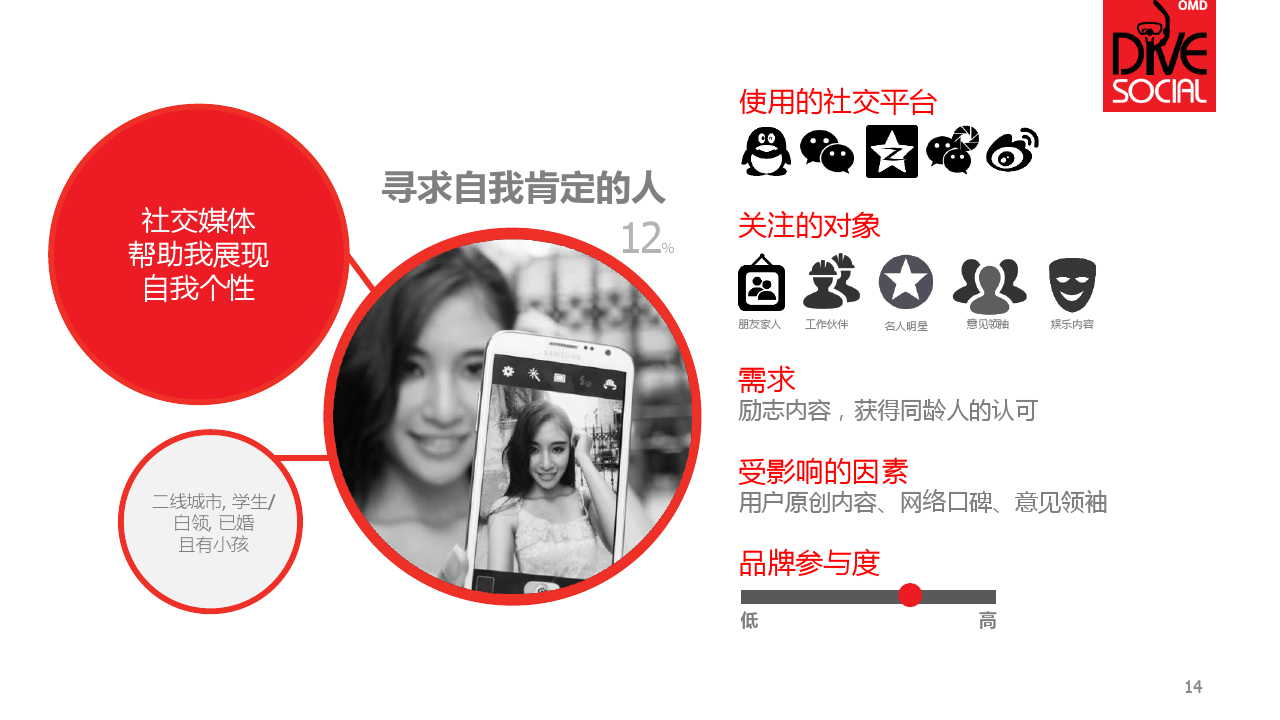 - 寻求自我肯定型(12%)——这类型用户在社交媒体上展示自我个性。来自二、三线城市的年轻有为者把社交媒体视为展现自我、争取更高成就的一种手段。