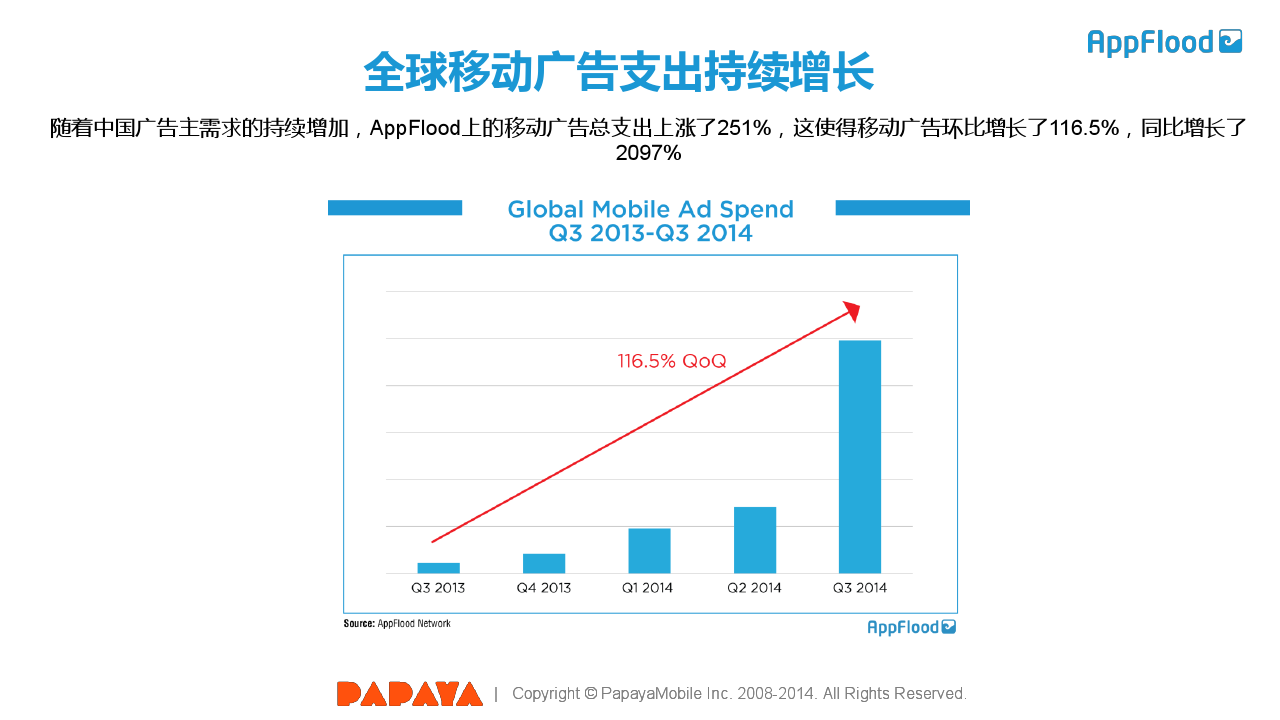 北京时间2014年10月15日,木瓜移动AppFlood发布了全球安卓移动广告市场2014年第三季度报告,该报告的所有数据和分析均来自于木瓜移动AppFlood移动广告网络,包括AppFlood上的安卓广告主、发布商和其他合作伙伴。
