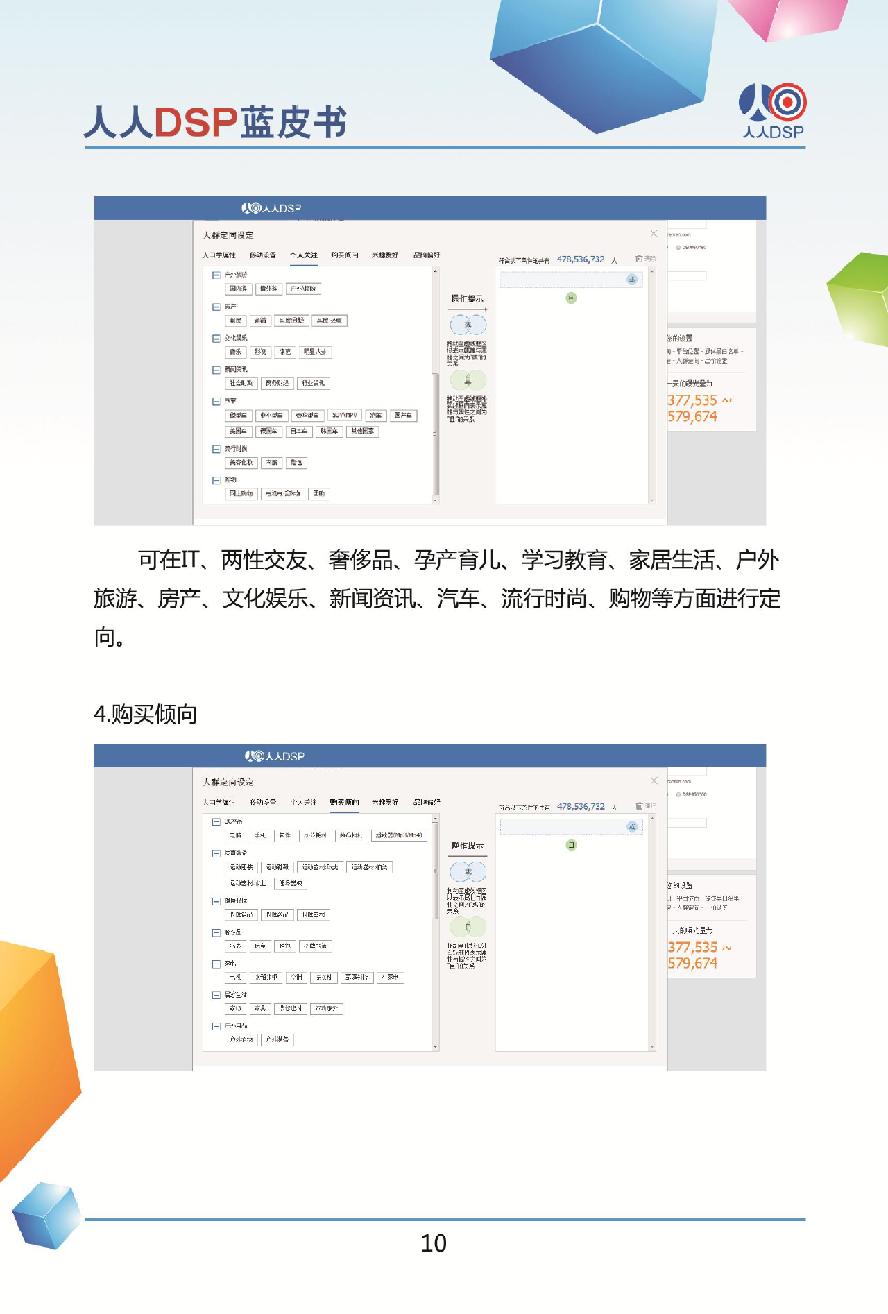 人人DSP正是在上万个用户标签中,挑选近3000个具有商业价值的标签进行分析和归类,将数据资源细分为六大类,即人口学属性、移动设备、个人关注、购买倾向、兴趣爱好、品牌偏好。相较行业普遍使用的标签演算推测手段,人人DSP数据则具备人人网真实的注册要求和互动机制,促使用户主动填写各维度信息,可精准的对人物进行测写与描述,多维度获取受众的基本属性信息。
