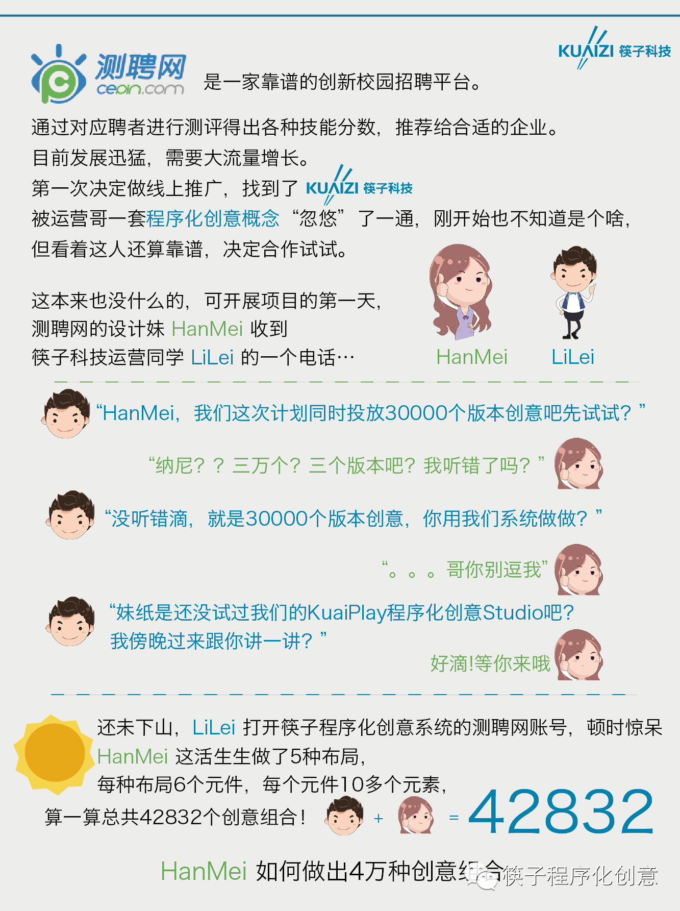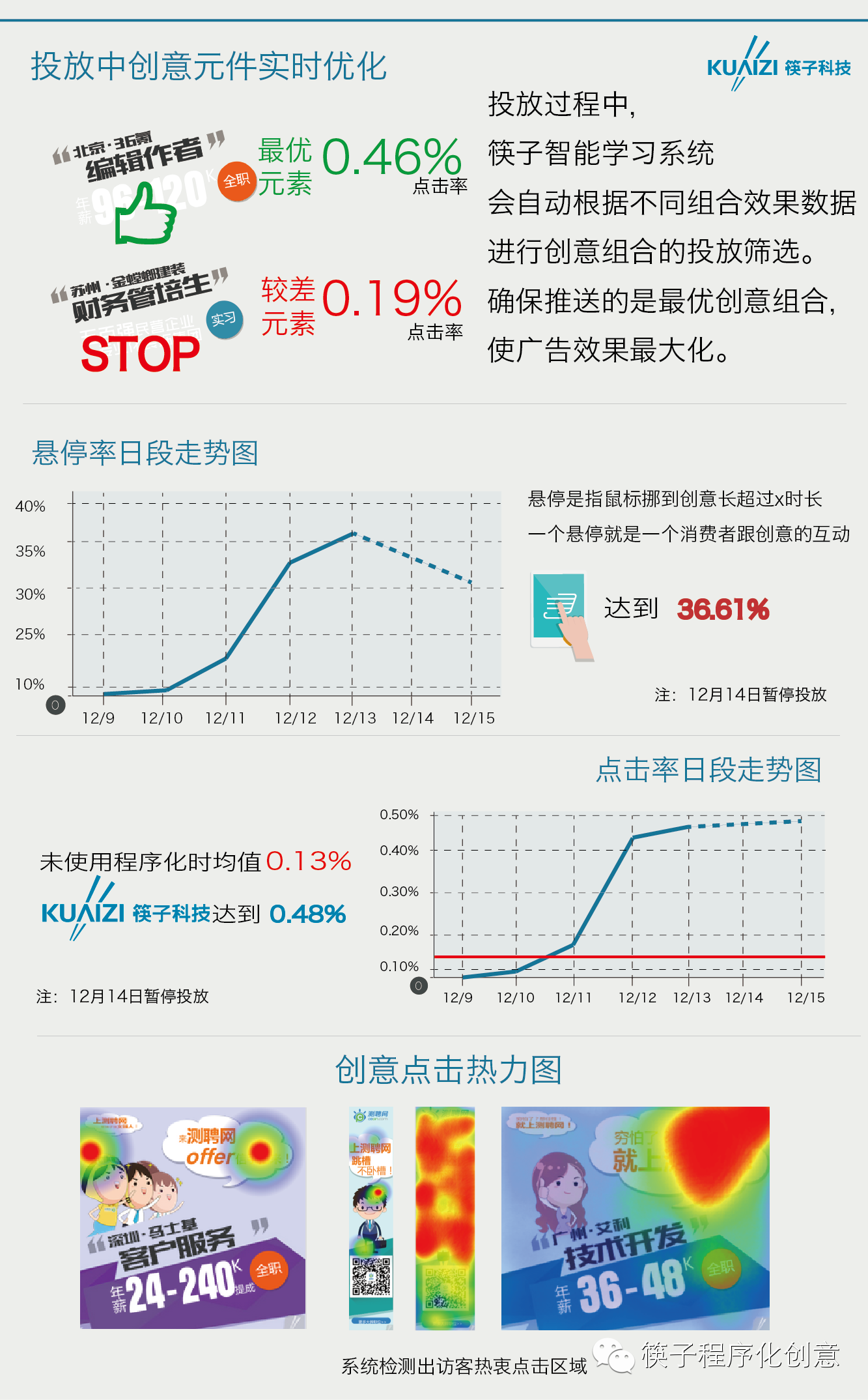 筷子程序化创意让测聘网一夜间多了40000多创意,直接让广告点击率提升了300%,怎么做到的?进来涨姿势!战斗在程序化广告第一线的童鞋们,别忘了广告的本质是个创意活啊。