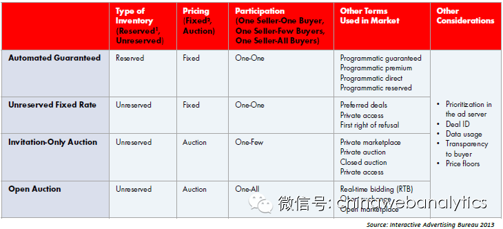 在国际广告局(IAB)的介绍程序化广告的标准文档中,我们会看到上面所说的四种方式,如下表所示。我就不翻译了,大家自己看。IAB用的名字跟中国人喜欢用的名字(虽然都是英语)有所不同,不过我相信这对你不是问题,你肯定能够很轻松地对号入座。读懂了我上面的文字,下表也就不是问题了。甚至,当我们国家的互联网公司再推出让你莫名其妙的广告产品的时候,你也会立即恍然大悟,原来是这个意思!